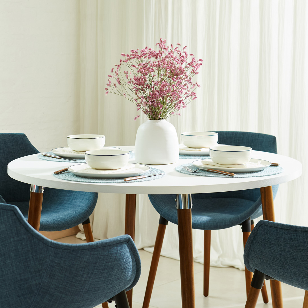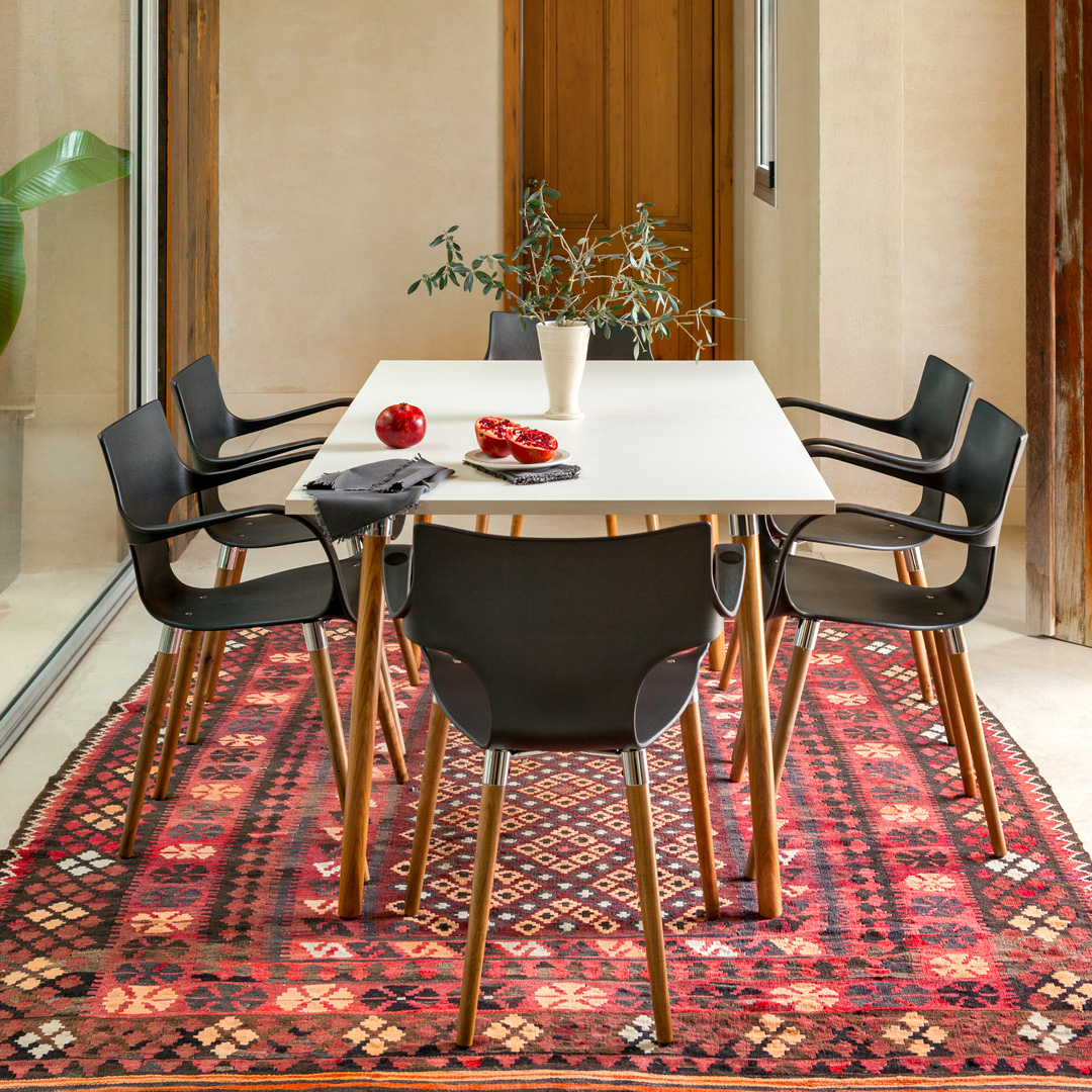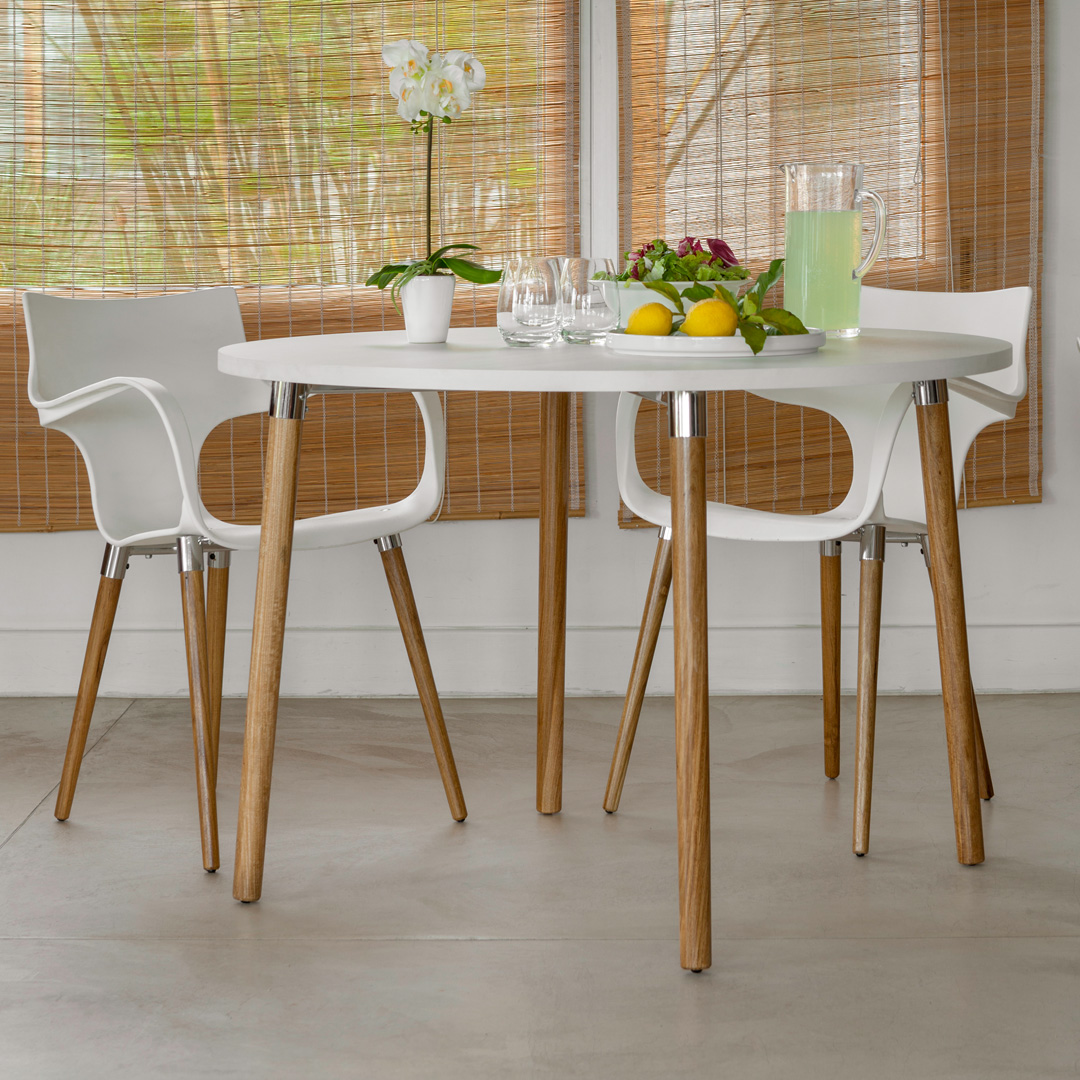 Diseño clásico y elegante con patas de madera petiribí y detalles cromados. Disponible en formas redonda, cuadrada y rectangular, es perfecta para quienes buscan una mesa que combine calidez, sofisticación y resistencia.