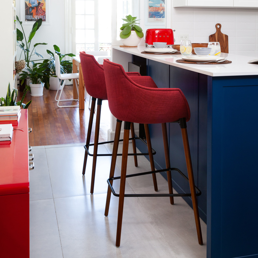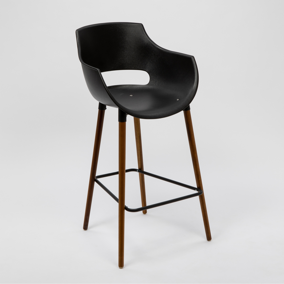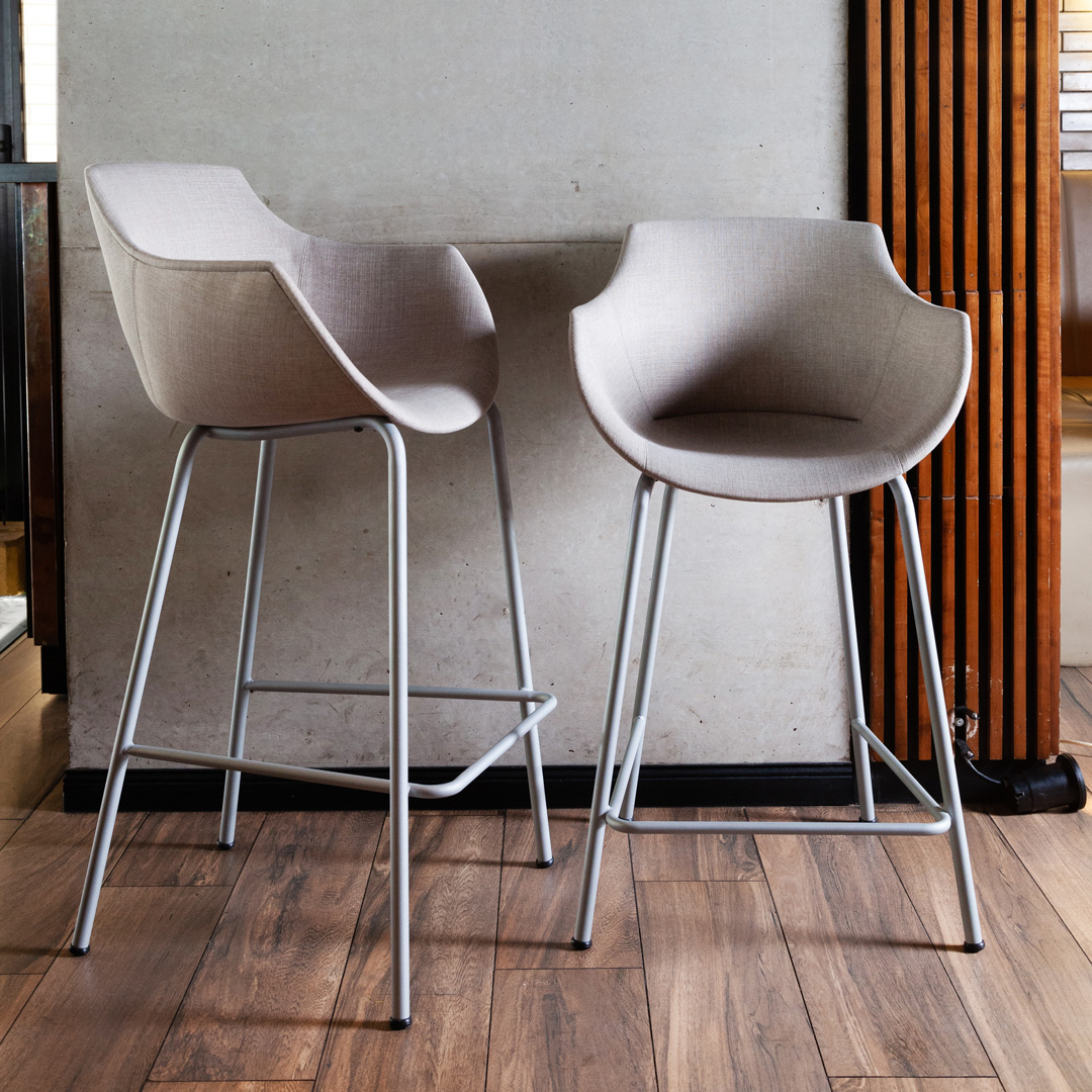 Con su asiento amplio y diseño monocasco que incluye apoyabrazos, el taburete Frida es perfecto para espacios donde la funcionalidad y la estética son esenciales. Disponible en distintas alturas y estilos de base.